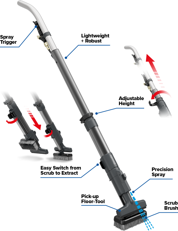 Ulaşılması zor alanlara ulaşın; hepsi bir arada çözümle zeminleri temizleyin, ovun ve kurulayın. Hassas sprey ile yoğun kirli alanları, acil dökülmeleri, köşeleri, kenarları ve engellerin etrafını ovun, vakumlayın ve kurulayın. Her yeri temizleyin, halı ve sert zeminler arasında kitleri kolayca değiştirin.